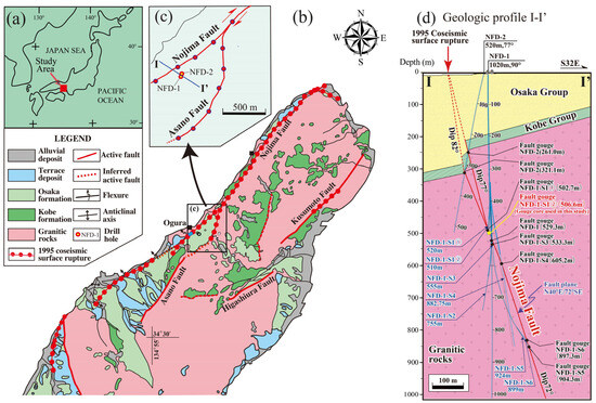 Maps of the study area, showing the main geology and active faults. (a) The study area, (b) geological map of the north Awaji Island (adapted from Mizuno et al. [20] and Lin and Nishiwaki [15]), (c) location of the Nojima fault drilling site, and (d) geologic profile (modified from Lin and Nishiwaki [15]). Data on active faults are from the Research Group for Active Faults of Japan [17]; data on the 1995 surface-rupture zone was taken from Lin and Uda [18].