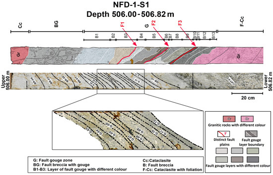 Sketch and photograph showing the core (NFD-1-S1-②) retrieved from the 506–507 m depth of the NFZ, which contained fault gouge, breccia, and cataclasite (taken from Tsakalos et al. [16]). Codes (CAT-01, BR-01 to BR-03, G-01 to G-14, and GB-15) correspond to cataclasite, breccia, and gouge samples used in the OSL study by Tsakalos et al. [16]. The selection of samples for ITL dating (this study) was based on the availability of the remaining mineral grains after chemical treatment as well as any quantity left after OSL dating.