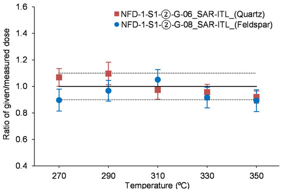 The natural quartz (sample NFD-1-S1-②-G-06) and feldspar (sample NFD-1-S1-②-G-08) ITL signal (five aliquots from each sample) was zeroed by heat (450 °C for 1 h), and a fixed beta dose of 200 Gy was subsequently given. ITL measurements were then conducted at different temperatures (from 270 to 350 °C, in 20 °C steps). For both quartz and feldspar, the given/measured dose ratio, using temperatures between 270 °C to 310 °C, was close to unity (the measured dose is nearly identical to the given dose; Figure 3), and a measurement temperature at 310 °C was selected for the following ITL measurements. Furthermore, recycling ratios of the measured aliquots were systematically in the range of 0.89 to 1.1, and recuperation was below 5%. From these tests, it could be suggested that the SAR-ITL protocol can produce reliable known laboratory doses for both quartz and feldspar within a range of measurement temperatures.