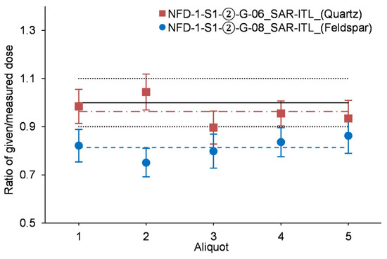 Dose recovery (given/measured dose ratios) of fine-grained quartz (NFD-1-S1-②-G-06) and medium-grained feldspar (NFD-1-S1-②-G-08) samples. Aliquots of both quartz and feldspar (five aliquots for each sample) were first bleached for 4 h in the sun, and a laboratory dose of 200 Gy was given; then, the aliquots were measured using the SAR-ITL protocol. The dash-dotted and dashed lines are the mean given/measured dose ratios of NFD-1-S1-②-G-06 and NFD-1-S1-②-G-08 samples, respectively. The black solid line represents a value of 1.0, and the black dotted lines are the “acceptability” limits (0.9 and 1.1).