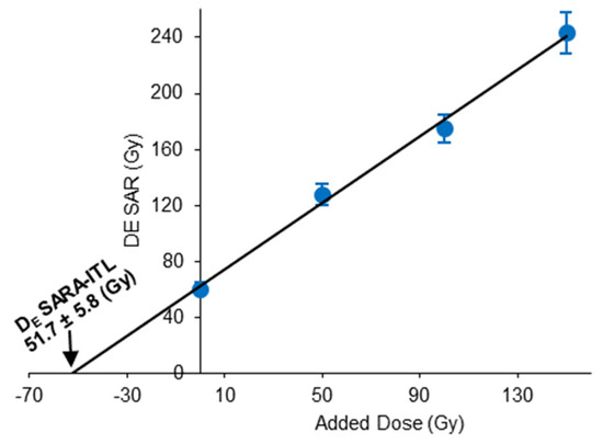 Buylaert et al. [23] and Mejdahl and BZtter-Jensen [26] proposed employing the SARA-ITL procedure to address and resolve issues related to initial changes in luminescence sensitivity. As such, the inaccuracy in the dose-recovery experiment of feldspar was further investigated by performing a dose-recovery test using the SARA-ITL procedure. To perform the SARA-ITL dose-recovery test, 15 additional aliquots (three groups of 5 aliquots of sample NFD-1-S1-②-G-08) were first bleached for 4 h in sunlight, and a 50 Gy dose was given, which was considered the natural group (N). Then, to each group containing the natural (50 Gy) dose, different laboratory doses (N + 0, N + 50, and N + 100 Gy) were added. The five feldspar DE values obtained using the SAR-ITL dose-recovery test above were also used as the N + 150 dose group, to assist in the calculation of the DE values using the SARA-ITL dose-recovery test. Then, five groups were made, each containing one aliquot with a different added dose (N + 0, N + 50, N + 100, and N+ 150 Gy), and the SAR-ITL protocol was used to provide a DE value for each aliquot. The SAR-ITL DE values of each group were then plotted against the added doses (Figure 5).