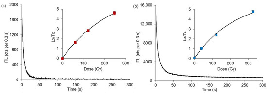 Dose-response growth and luminescence decay curves for the SAR-ITL signal at 310 °C for (a) a fine-grain (4–11 μm) quartz (sample NFD-1-S1-②-G-12) and (b) a medium (80–125 μm) feldspar (sample NFD-1-S1-②-G-08) aliquot.