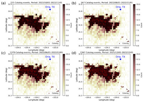 Detection and location results (33,319 events) of EQCCT compared with TexNet events in different periods: (a) Location comparison between EQCCT events and one-month catalog events. (b) Location comparison between EQCCT events and three-month catalog events. (c) Location comparison between EQCCT events and six-month catalog events. (d) Location comparison between EQCCT events and one-year catalog events.