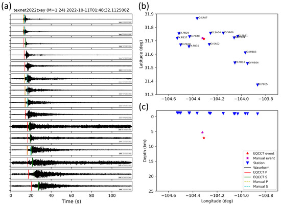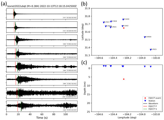 Pick verification on the event texnet2022ubqt (0.384 Ml), which was detected only by EQCCT and is not in the TexNet catalog: (a) Waveforms. From top to bottom, the epicentral distance increases. The time shown on the top of the waveforms is the start time of the segmented 120 s waveforms (10 s before the event origin time). The red and green lines mark the EQCCT-picked P- and S-wave arrivals. (b) Station and event locations on the map. (c) Station and event locations on the depth slice. In this case, the event was detected by eight stations using EQCCT. Due to the small magnitude and relatively low signal-to-noise ratio of the waveforms, this event was almost impossible to detect by analysts.