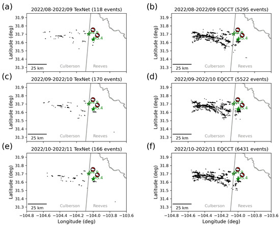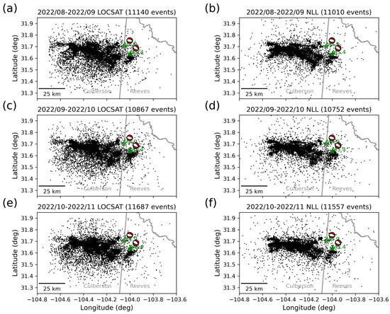 Single-month comparison of relocation results between the TexNet catalog and the EQCCT catalog: (a) Relocated TexNet catalog between 2022/08 and 2022/09. (b) Relocated EQCCT catalog between 2022/08 and 2022/09. (c) Relocated TexNet catalog between 2022/09 and 2022/10. (d) Relocated EQCCT catalog between 2022/09 and 2022/10. (e) Relocated TexNet catalog between 2022/10 and 2022/11. (f) Relocated EQCCT catalog between 2022/10 and 2022/11.