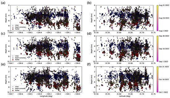 Single-month comparison of relocation results between the TexNet catalog, initial, and depth-corrected EQCCT catalog. Blue squares are relocated initial catalog. Red squares are relocated TexNet catalog. Circles are relocated depth-corrected catalog, which are color-coded by origin times: (a) Relocated catalog in the longitude-depth slice between 2022/08 and 2022/09. (b) Relocated catalog in the latitude-depth slice between 2022/08 and 2022/09. (c) Relocated catalog in the longitude-depth slice between 2022/09 and 2022/10. (d) Relocated catalog in the latitude-depth slice between 2022/09 and 2022/10. (e) Relocated catalog in the longitude-depth slice between 2022/10 and 2022/11. (f) Relocated catalog in the latitude-depth slice between 2022/10 and 2022/11.