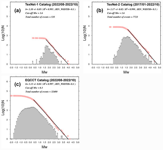 We first converted Ml (local magnitude) to Mw (moment magnitude) using a scaling law. We then used the converted Mw to establish the magnitude-frequency distribution [37] for the CMEZ, using the EQCCT catalog of 2022/08–2022/10. In addition, in order to compare b-values (an indicator about the causal factor) resulting from different datasets for the same area over time, we determined b-values using TexNet’s catalogs of 2022/08–2022/10 (referred to as TexNet-1) and 2017/01–2022/10 (referred to as TexNet-2), respectively. As expected, we obtained three different b-values out of three different datasets, as shown in Figure 9. Here, we summarize the comparison results.