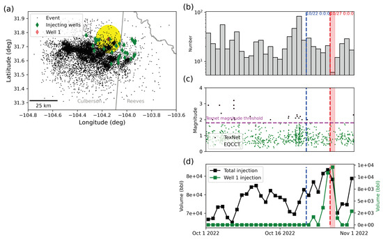 Association of seismicity with fluid injection: (a) Spatial distribution of the detected events in October 2022. (b) Daily distribution of the events. (c) Daily magnitude distribution. (d) Daily injected volumes of all wells in the target area (yellow circle in (a)) and the center well.