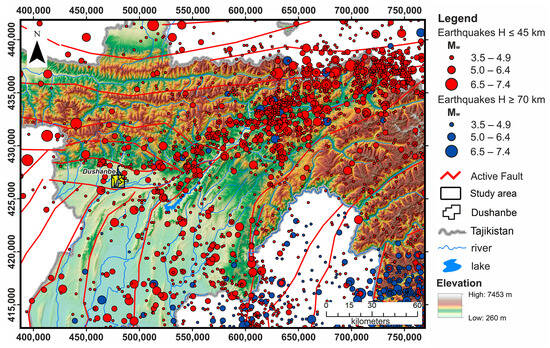 Epicenters of shallow (depth ≤ 45 km; shown in red) and deep-focal earthquakes (depth ≥ 70 km, shown in blue), according to the catalogs of the Central Asia Seismic Risk Initiative, Earthquake Modeling for Central Asia Catalogue (CASRI-EMCA; [36,37]) for the period from 818 CE to 2017, supplemented with data from the updated catalog of the U.S. Geological Survey (USGS) for the period from 2017 to 2023. Active faults are highlighted in red and marked by references in the text. Coordinates refer to the UTM 42N zone.