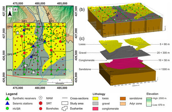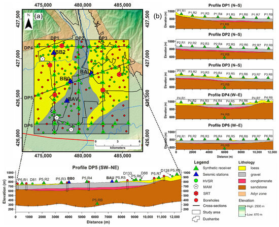 Comprehensive overview of input data the study area in Dushanbe, covering an area of 12 × 12 km2; (a) map indicating 80 boreholes, three MAM, five SRT surveys, placement of four temporary seismic stations for SSR analysis, and HVSR measurements at 100 points across the study area (see detailed in the first part of our project by Hakimov et al. [34]); (b) lithological cross-sections of six 2D geological profiles 12 km in length, used for 2D dynamic numerical modeling, with a display of synthetic receivers on the surface.