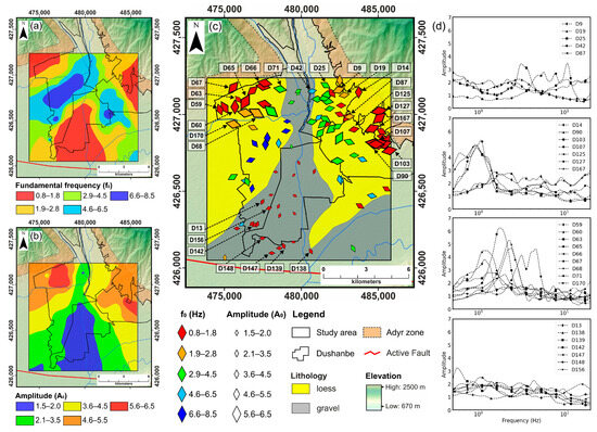 A map illustrating the site effects on the study area can be seen in Figure 6a. As part of this study area’s initial approach to seismic microzonation, we first performed interpolating values: fundamental resonance frequencies of HVSR (the most pronounced low-frequency peak) and corresponding peak amplitudes (Figure 4).