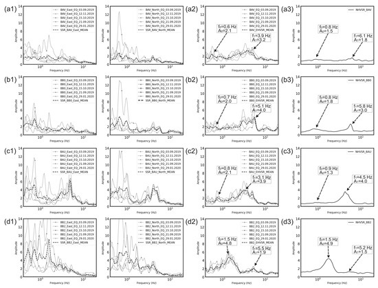 Station BB0, positioned on the side opposite BAU, is situated atop a slim loess layer (5–10 m), beneath which lies a layer of gravel, as depicted in Figure 3a. Consequently, its peak pattern resembles station BAV, established on a gravel base. The SSR graphs illustrate modest amplitude peaks within the 0.6–1 Hz frequency range, reaching amplitudes between 2 and 4. Furthermore, these graphs show a slight amplitude rise in the 4–6 Hz frequency spectrum. This increase is more pronounced in the EHVSR curve, exhibiting amplitudes of 3–6. On the NHVSR curve, a subtle but distinct peak at 5.8 Hz with an amplitude of 3 indicates its location above a thin layer of loess, as shown in Figure 5(b1–b3). The correlation of these data with data from nearby boreholes and geologic cross-sections confirms the existence of a surface layer of loess above the gravel layers, as shown in Figure 3a.