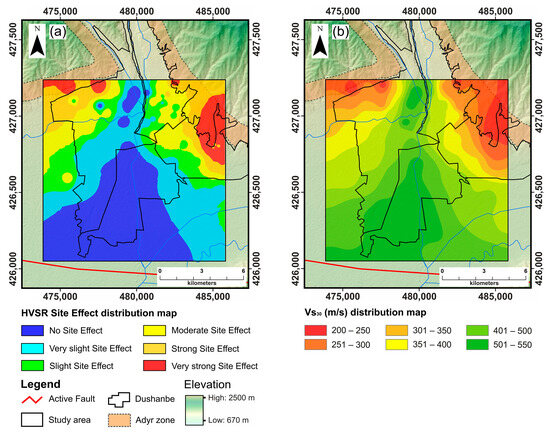 Distribution of site effects in the study area and comparison with Vs30 results. (a) map illustrating the distribution of the site effects, showing the combined influence of the resonance frequency (f0) and amplitude (A0) of HVSR; (b) map demonstrating interpolated values of Vs30 (seismic wave propagation velocity at a depth of 30 m).