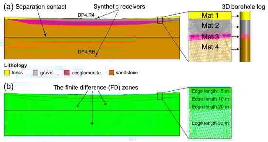 where Vs (m/s) is the shear wave velocity, and f (Hz) is the modeled frequency. In models using Mat1 (loess) with Vs = 320 m/s and an upper frequency of 8 Hz, ∆l is about 5 m. Larger FD zones are used in the lower parts of the model to speed up seismic energy calculations. Accurate alignment of nodes between neighboring zones is critical to avoid artificial reflections, especially at contacts between zones of different sizes. Although computationally expensive, this alignment is often necessary for accurate modeling (see details in Section 4.4).