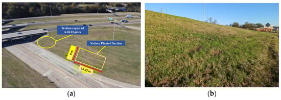 The slope near Terry Road along Interstate I-20 Interchange in Jackson, Mississippi, was selected for the study. The slope soil type is Yazoo clay, characterized as a highly expansive soil with a weathered upper zone overlaying unweathered clays. Weathered Yazoo clay typically exhibits a plasticity index exceeding 50%, attributed to a liquid limit ranging from 70% to 100% and a plastic limit of 20% to 30%. Previous observations [5] indicated signs of slope movement at 1.5 m depth. A section of the slope near the existing bridge experienced a shallow rainfall-induced landslide, which was repaired using H-piles. A study conducted on the impact of rainfall on the slope’s shear strength found that the slope soil exhibited an increased void ratio with an increase in the number of wet–dry cycles. Stability analysis conducted on the representative slope observed a reduced factor of safety due to rainfall events [2]. The slope has a height of 4.572 m and a slope ratio ranging from 3.5H:1V to 4H:1V. The movement of the section without the H-pile was monitored using an inclinometer for one year starting from January 2019. The inclinometer data indicated a movement of up to 1.6 inches at the slope surface for the year 2019 [5]. For reinforcement, a 15.25 m wide section of the slope was chosen, and the ‘Sunshine’ Vetiver grass genotype (Chrysopogon zizanioides or Vetiveria zizanioides) was planted at a spacing of 0.6–0.9 around an area of 65 m2 (Figure 3). The plantation was done at the section where there were no H-piles installed. Due to the tropical character of the grass, planting was conducted to guarantee adequate precipitation, which promotes grass growth. The plantation was done in a staggered way. As the Vetiver root is fibrous enough to spread inside the slope soil, the spacing of 30.48 cm (1 ft) was taken considering the ease of the manual plantation process. It is suggested to plant the Vetiver at the beginning of the rainy season to have sufficient irrigation [43]. Considering this, the plantation was conducted in July 2020 when there was a lot of rainfall in Mississippi. The grass was allowed to grow naturally, and no modifications were made to the surrounding vegetation during the planting process.