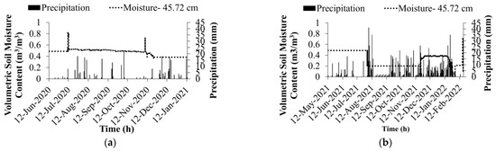 As part of the process of carrying out the analysis, the information about the moisture content of the slope for the years 2020–21 and 2021–22 was meticulously analyzed. The moisture content of the slope soil was initially higher (about 0.5 m3/m3) (Figure 6a), which may indicate that there is a perched water zone at shallower depth. The moisture content started to decrease in August of 2021, which was more than a year after the plantation was formed.