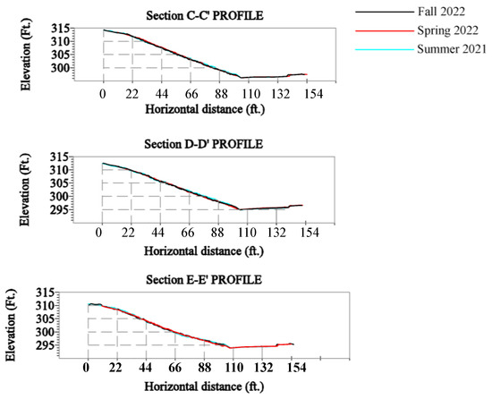 After field data collection, surface data from each season were superimposed, and alignments were established along the slope. Following this, surface profiles were created by utilizing the alignments along the Vetiver sections C-C’, D-D’, and E-E’ (Figure 7). This process involved superimposing the surfaces to compare the changes over different seasons, and the alignments along the specific sections allowed for the generation of detailed surface profiles in relation to the Vetiver planting areas.