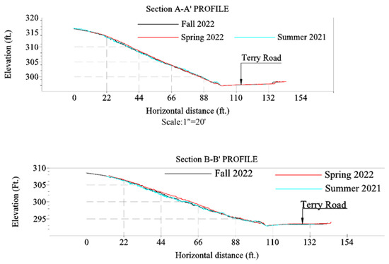 The attractiveness of LiDAR instruments comes from their high spatial and temporal resolution of measurements, the capability to observe the atmosphere under ambient conditions, and the potential to cover the height range from ground level to over 100 km altitude [44]. Conducting recurring LiDAR point cloud surveys at a consistent location over time aids in monitoring subtle changes within geotechnical assets and mapping potential risks [45]. This current study applied 3D laser scanning with the terrestrial LiDAR equipment Trimble X7. Dense point cloud data were captured from the slope, and topographical surfaces were generated using the dense point cloud data, followed by the extraction of bare ground. Temporally spaced surface profiles for both the failed and undamaged sections of the slopes were created for comparative analysis (Figure 5).