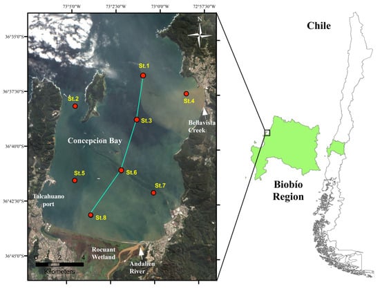 Concepción Bay is a semi-enclosed coastal embayment of 167.4 km2, located at 35°42′ S–73°0.3′ W, and distinguished by its north–south orientation that enhances a marked seasonal wind-modulated change in its circulation pattern [37]. Seasonal sampling was carried out on board the R/V Don Antonio during the austral summer (3–4 January), fall (30–31 May), winter (29–30 August), and spring (29–30 November) of 2018. Eight stations were sampled to cover the greatest variability of the bay (e.g., marine influence—St. 1 and 2, tributaries—St. 4 and 7, and wetlands—St. 8), as well as zones of large anthropogenic impact (e.g., port activities—St. 5 and 7, ship refueling—St. 6, and influence of outfalls—St. 7)—see Figure 1. Sampling information, including dates and the parameters evaluated, is summarized in Table 1, whereas the positions and depths of sampling at each station are shown in Table 2.