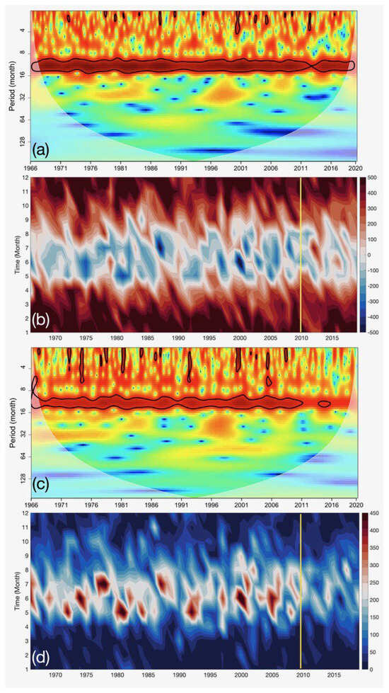 (a) Wavelet analysis and (b) monthly averages of Ekman transport for the 1966–2019 period. (c,d) represent the same analysis, respectively, but for precipitation during the same temporal period. Yellow lines indicate the period of a major change in their magnitudes, especially for winters.