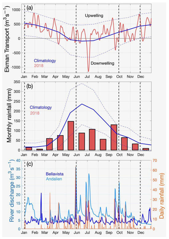 (a) Ekman transport (along 1000 m of coast band) for 2018 (red) and the mean climatology (blue curve). Positive (negative) values denote upwelling (downwelling) transport. (b) Monthly accumulated precipitation for 2018 (red) and the mean climatology (blue curve). The variability (±1 SD) of the Ekman transport and precipitation climatologies is denoted by horizontal dashed blue lines. (c) Daily river discharges for the Andalien River (light blue) and Bellavista Creek (blue) and daily rainfall (orange) are shown for 2018. Vertical dashed lines denote the in situ sampling dates. Red arrows denote peaks of extreme precipitation events during 2018.