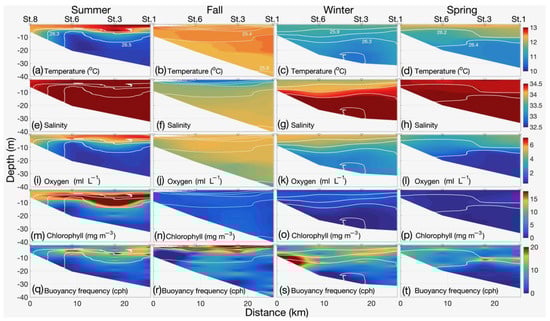 Temporal variability and vertical distribution of temperature (a–d), salinity (e–h), oxygen (i–l), chlorophyll-a (m–p), and buoyancy frequency (q–t) along a meridional transect (south to north) that considers stations: 8, 6, 3, 1 (see Figure 1) for the sampling seasons: summer (a,e,i,m,q), fall (b,f,j,n,r), winter (c,g,k,o,s), and spring (d,h,l,p,t).