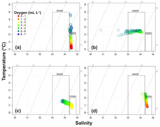 T/S diagrams for the summer (a), fall (b), winter (c), and spring (d). Note that the dissolved oxygen variability in the T/S diagrams is represented by the gradient in dot colors. Furthermore, the area with the characteristic values of temperature and salinity corresponding to the main water masses (i.e., SAAW and ESSW) are demarcated by rectangular boxes.