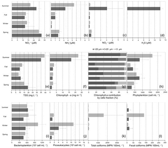 Temporal variability and vertical availability of nitrate (a), nitrite (b), ammonium (c), hydrogen sulfide (d), total suspended solids—TSS (e), total (f) and fractionated (g) chlorophyll-a, and abundances of phytoplankton (h), bacterioplankton (i), picoeukaryotes (j), and total (k) and fecal (l) coliforms. Note that for each season (vertical axis), there are two bars that represent the average values for the surface (light gray) and bottom (dark gray) layers, except for (g), where cell fractions are represented by different colors according to the legend on top. In this case, and for each season, the upper bar represents the surface layer, and the lower the bottom ones. Horizontal lines, when corresponding, denote the standard deviation.