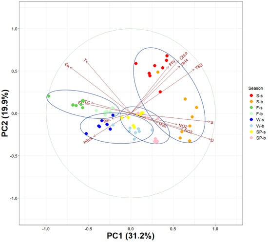 To identify underlying relationships between the evaluated hydrobiological parameters, as well as segregations and/or clusters among them, a principal component analysis (PCA) was employed. This tool reduces the dimensionality of a data set by keeping the elements that contribute the most to its variance [57]. Furthermore, to evaluate the existence of space-time variations in the environmental variables, an analysis of variance based on multiple permutations (PERMANOVA) was carried out, considering the factors: seasonality (summer, fall, winter, and spring), sampling stations, and stratus (surface and bottom), using the distance matrix of the environmental variables obtained from Euclidean distances of the normalized data, considering 9999 permutations [58]. These analyses were performed using the library Vegan [59] from the software R version 4.3.0 [60].
