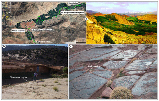 (a) Location of the two main hiking trails in the Ait Bouguemez valley (Google Earth image 2023). (b) Example of a geosite in the valley showing traces of dinosaurs. (c) Several sites of rock carvings that also can be visited in the valley.