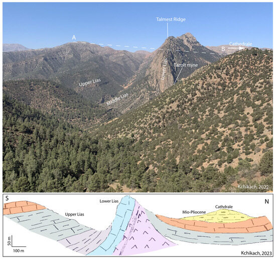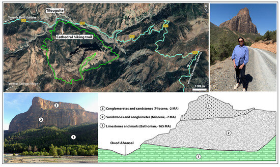 From the summit of Imsfran Cathedral rock, visitors can enjoy a view dominated by the Talmest Ridge (Figure 6). This ridge represents a faulted anticline structure featuring injections of Triassic red clay and magmatic rocks. It is encircled by calcareous formations of the lower, middle, and upper Lias, each showing distinctly different dips from the south to the north side of the anticline. The Miocene–Pliocene conglomerates and sandstones of the Imsfran rock rest against the northern flank of this structure. These formations were elevated to their present heights by the Atlas orogeny and subsequently shaped by erosion into their current spectacular forms. Additionally, visitors may explore the nearby zinc mine, which contains mineral deposits embedded in the carbonates of the Lower Lias [35].