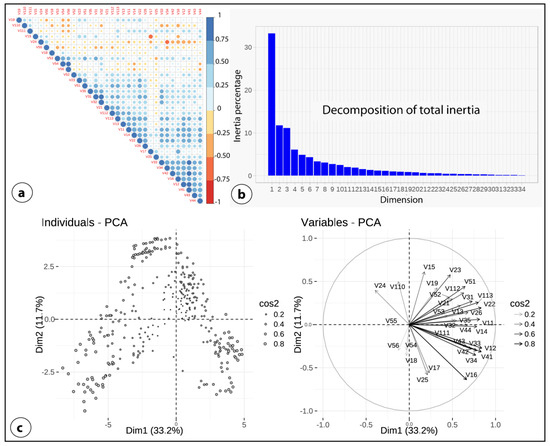 (a) Correlation between the studied variables (the larger the circle diameter, the closer the correlation coefficient to 1). (b) Distribution of the total inertia of the collected dataset. (c) Representation of individuals and variables in the 1:2 factorial plane (The cos2, which is approximately greater than 0.6, expresses the representativeness of individuals and variables in this plane).