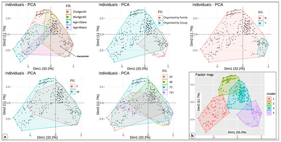 To better correlate groups with field survey modalities, we characterized each corresponding point cloud by its barycenter (Figure 8a). The PCA analysis identified four distinct groups of individuals (clusters, Figure 8b). For instance, we found that foreign visitors and those traveling with their families predominantly fall within group 2. Meanwhile, younger individuals, particularly those under the age of 45, are more likely to be categorized in group 1.