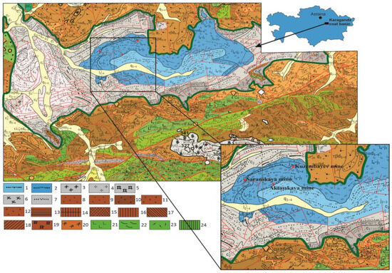 - Bekman, V.M.; Seydalin, O.A.; Zinova, R.A. Geologiya Karagandinskogo Ugolnogo Basseyna. Kollektiv avtorov. In Karaganda Coal Basin. Joint Authorship; Nedra: Moscow, Russia, 1972; p. 415. Available online: https://rusneb.ru/catalog/000016_000021_CHONB (accessed on 23 January 2024). (In Russian)
