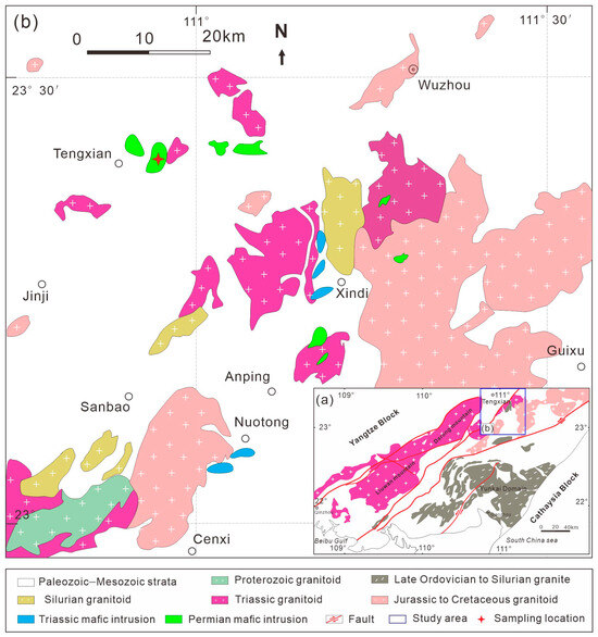 (a) Geological map of Yunkai Massif showing (b) the distribution of Permian–Triassic Tengxian mafic intrusions. Modified after Zhao et al. [17].