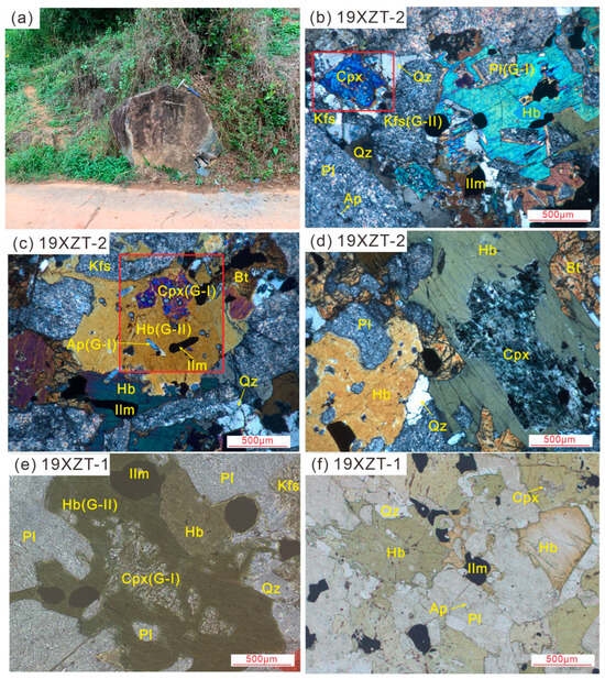 A photo of the sampling location in the field (a) and the mineral assemblage of hornblende gabbro (b–f). Photo (b) illustrates Pl inclusions in Hb and a subhedral Cpx surrounded by Kfs and Qz. Photo (c) shows Ap and Ilm inclusions in Hb. Photo (d) exhibits a mineral assemblage of Cpx (sieved), Hb, Pl, Bt, and Qz (anhedral). Photo (e) illustrates Ilm inclusions in Hb. Photo (f) shows the subhedral to euhedral Hb and the sieved Cpx. Mineral abbreviations: Cpx—clinopyroxene; Hb—hornblende; Pl—plagioclase; K-feldspar—Kfs; Bt—biotite; Qz—quartz; Ap—apatite; Ilm—ilmenite; G-I—Generation I; and G-II—Generation II. See details in the text. The red outlines in photos (b,c) indicate the fields for elemental mapping.