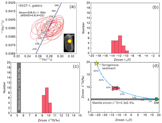 The zircons from the Tengxian hornblende gabbro (19XZT-1) are transparent crystals and have Th/U ratios ranging from 0.57 to 1.10, indicating a magmatic origin. The U-Pb dating of them yields a weighted mean 238U/206Pb age of 249.6 ± 1.5 Ma (MSWD = 0.6, n = 22, Figure 3a), confirming its emplacement during the early Triassic era. They have εHf(t) values from −14.0 to −9.5 (Figure 3b) and δ18O from 9.2 to 10.1‰, with an average of 9.7‰ (Figure 3c), much higher than the value of normal mantle zircons (δ18O = 5.3 ± 0.3‰) [58]. In an εHf(t) versus δ18O diagram (Figure 3d), the zircons plot around the mixing curve between the depleted mantle and a terrigenous sediment component [59,60,61,62], suggesting the involvement of recycled crust in their petrogenesis.