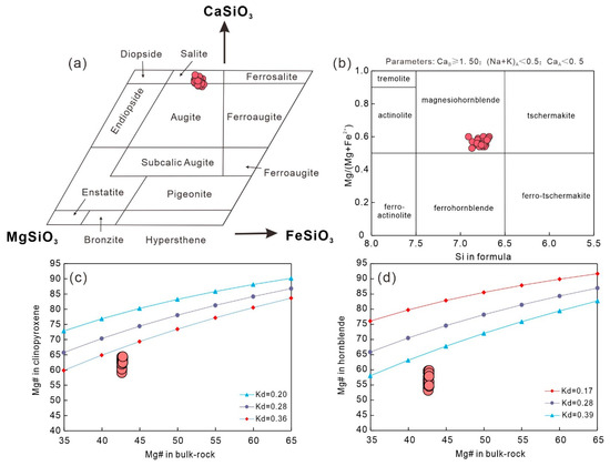 (a) CaSiO3-MgSiO3-FeSiO3 classification diagram of clinopyroxene. (b) A Si in formula versus Mg/(Mg + Fe2+) classification diagram of hornblende. A comparison of Mg# between the bulk-rock and clinopyroxene (c) and hornblende (d) in the Tengxian hornblende gabbros. The Fe-Mg partition coefficient (Kd) values of clinopyroxene and hornblende are from [63,64].