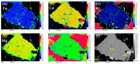 Mapping results of euhedral clinopyroxene and its surrounding quartz (Sample 19XZT-2). (a) FeO, (b) CaO, (c) Al2O3, (d) MgO, (e) SiO2, and (f) BSE image of coexisting minerals, the mineral abbreviations are referenced in Figure 2.