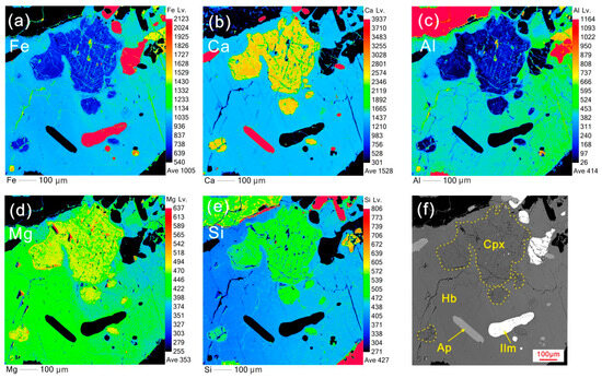 Mapping results of a sieved Cpx crystal and its surrounding hornblende and accessory minerals, showing the compositional disequilibrium and reaction texture (Sample 19XZT-2). (a) FeO, (b) CaO, (c) Al2O3, (d) MgO, (e) SiO2, and (f) BSE image of the mineral association, the mineral abbreviations are referenced in Figure 2.