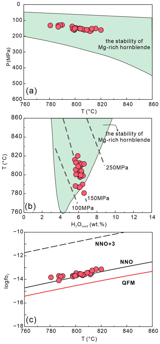 Based on the chemical compositions (Table S3), we use the thermobarometer to estimate the crystallization conditions of hornblende [66]. The results show that the hornblende crystallized under the conditions of T = 780–820 °C, P = 129–168 MPa, H2Omelt = 5.6–6.6 wt.%, and logfO2 = ΔNNO − ΔNNO + 0.45 (Figure 8). The crystallization temperature of hornblende is much lower than that of clinopyroxene, consistent with the petrographic observations that clinopyroxene crystallizes earlier than hornblende (Figure 2).