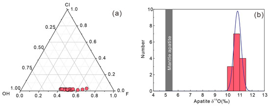 Plot of F-Cl-OH triangle classification diagram of apatite (a) and histograms of δ18O (b) of apatite crystals from the Tengxian hornblende gabbro.