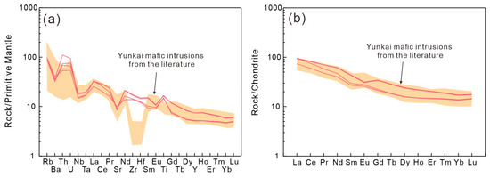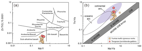 Plots of 10–4 × Zr/TiO2 versus Nb/Y (a) and Th/Yb versus Nb/Yb (b) [70] of the Tengxian hornblende gabbro. Comparative data of late Permian to early Triassic mafic intrusions in the Yunkai Massif are from t he literature [18,20].