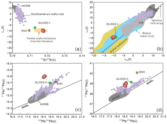 The Tengxian hornblende gabbros show narrow Sr-Nd-Pb-Hf isotopic variations (Table S8), with 87Sr/86Sr(i) = 0.7175–0.7180, εNd(t) = −10.6~−9.9, εHf(t) = −10.3~−9.4, 206Pb/204Pb(i) = 18.52–18.62, 207Pb/204Pb(i) = 15.78–15.80, and 208Pb/204Pb(i) = 38.91–39.05. They have similar Sr-Nd isotopic characteristics to the late Paleozoic to early Triassic mafic igneous rocks across the Yunkai Massif (Figure 12a). Compared to modern continental arc mafic rocks, the Tengxian hornblende gabbros have more radiogenic Sr and Pb (in particular, the 207Pb/204Pb(i) ratio) but less radiogenic Nd and Hf isotopic compositions (Figure 12). The Sr-Nd-Pb-Hf isotope compositions of Tengxian hornblende gabbros generally resemble those of GLOSS-II, which represents the average of global subducted sediments [71].