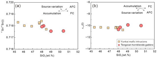 Crustal contamination/assimilation may lead to Sr and Nd isotopic variations, e.g., an increase in the bulk-rock 87Sr/86Sr(i) and a decrease in εNd(t) with the magmatic differentiation. As illustrated in Figure 13, there lacks any linear relationship between SiO2 and the bulk-rock 87Sr/86Sr(i) and εNd(t) in the Tengxian hornblende gabbros, precluding a significant effect of such open-system processes [10,20].