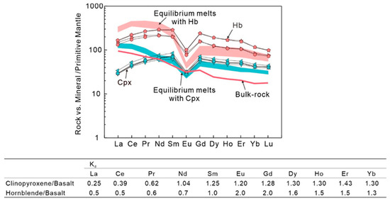The Tengxian hornblende gabbros show variable accumulation of clinopyroxene, in which the surrounding hornblende occurs as small-sized anhedral or veined crystals (Figure 2), suggesting a possible effect of the crystallization of intercumulus liquid [72]. In most cases, however, the hornblende occurs as coarse-grained euhedral to subhedral crystals and represents the later-stage crystallizing phase (Figure 2b,f). Even if the hornblende had crystallized from the intercumulus liquid, which should have also been in equilibrium with the clinopyroxene, the estimated composition of the interstitial melts, respectively, equilibrating with clinopyroxene and hornblende should be similar. However, as illustrated in Figure 14, the calculated melt in equilibrium with clinopyroxene has REE concentrations three to four times lower than that in equilibrium with hornblende. We therefore conclude that most of the hornblende could not have formed through crystallization of the assumed intercumulus liquid.