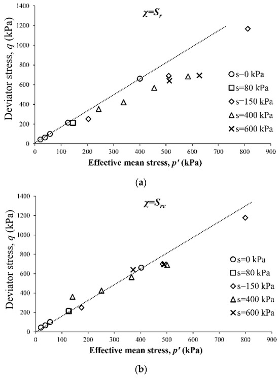 Several functional relationships have been proposed for χ, most of which relate it to the degree of saturation (Sr). Schefler [45] suggested that χ be equal to Sr. The use of this definition, in conjunction with experimental data for unsaturated soils with different values of matric suction, showed that a unique critical state line (CSL) was, however, not achieved in p’-q space. This observation is evident in Figure 1a, where it can be seen that for each value of matric suction (s), a different critical state line must be defined.