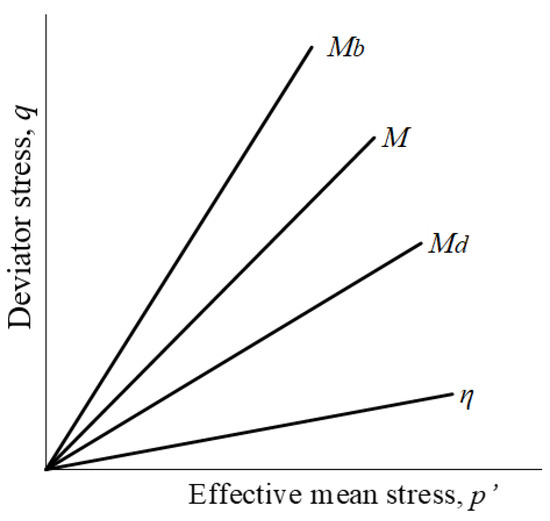 In p’-q space, the bounding surface is represented by a straight line with the slope of Mb (see Figure 4). Mb is related to the slope of the CSL, M, according to the following: