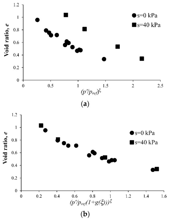 where, , , and are again model parameters. Unlike Equation (22), Equation (27) provides a unique CSL in space for unsaturated soils at different initial conditions. Figure 5b illustrates the normalization effect of Equation (27). It is evident that this normalization transforms the scattered experimental data shown in Figure 5a more nearly into a unique line.