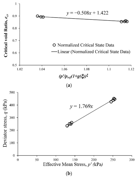 The seven parameters e0, λ, a, b, ζ, Mc, and Me are associated with the definition of the critical state. Values of e0, λ, a, b, and ζ are determined by fitting a straight line to data plotted in space. The parameters a, b, and ζ are then obtained using Equations (23)–(27). Values of e0 and λ correspond to the slope and intercept, respectively, of the aforementioned straight line. Finally, the values of Mc and Me correspond to the slopes of the CSLs that best fit the ultimate states of undrained stress paths, plotted in p’-q space, for axisymmetric triaxial compression and extension tests, respectively.